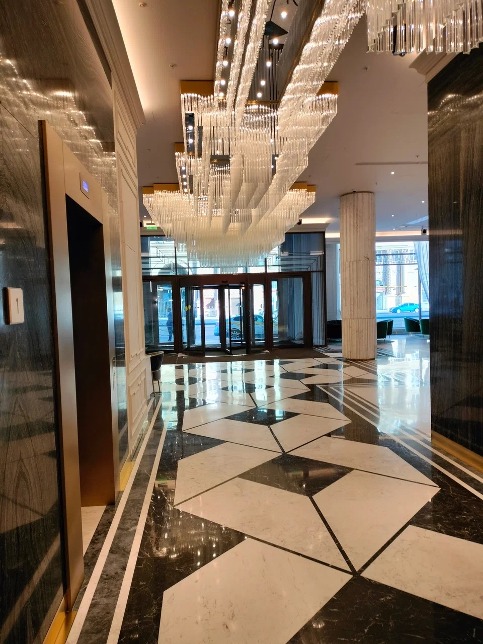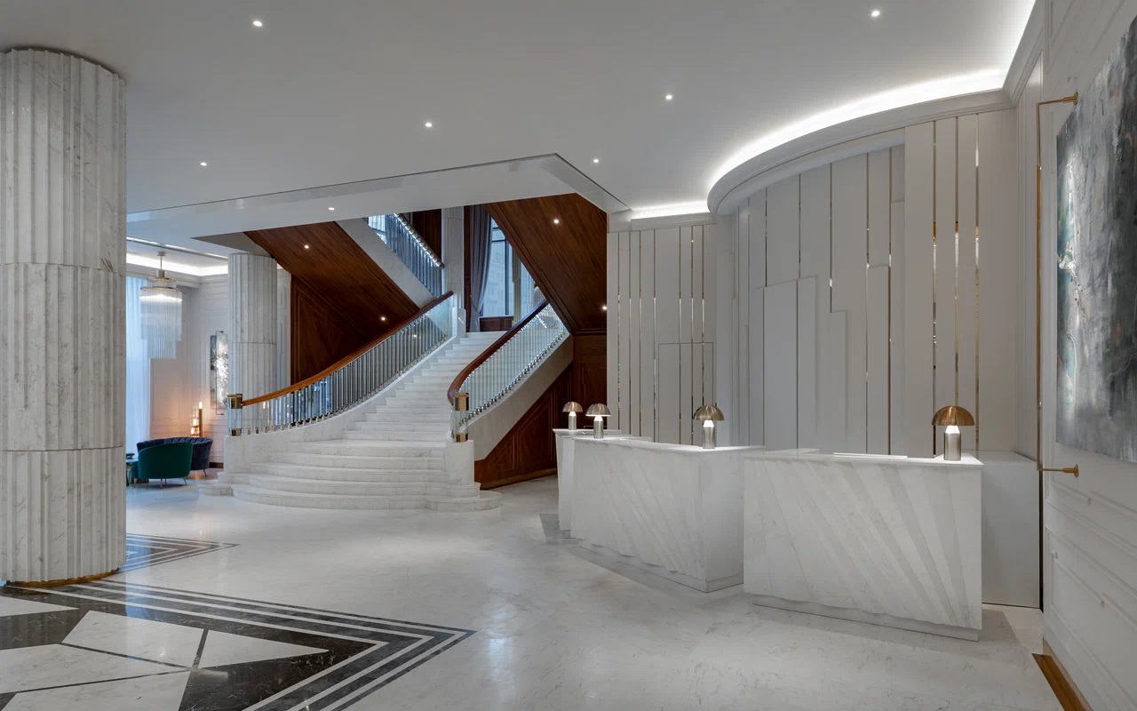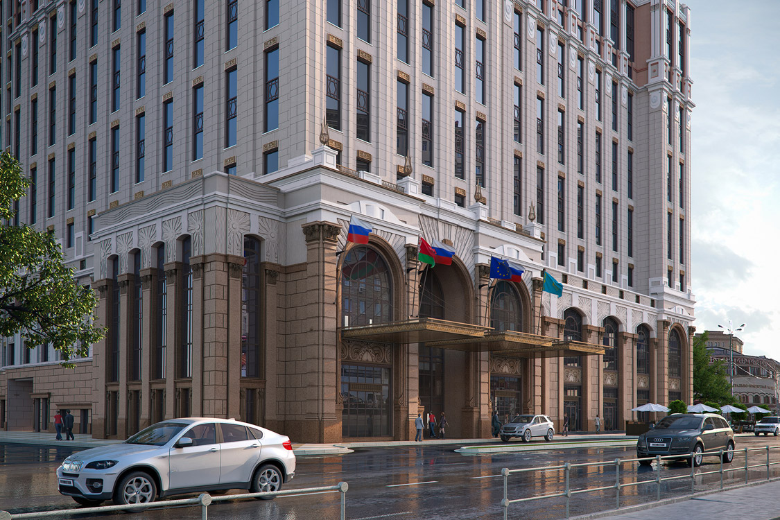 Офисы представлены на 4-18 этажах. Площадь 4 эт. – 446 кв. м, 5-13 эт. – 482 кв. м, 15-16 эт. – 882 кв. м, 17 эт. – 849 кв. м, 18 эт. – 426 кв. метров. Помещения имеют свободную планировку. В здании находится гостиница Marriott, конференц-зал на 1000 мест, лобби и торговая зона на первом этаже. На 14-м этаже расположен видовой ресторан. Соседнее здание – 4-этажный универмаг «Московский». Вблизи комплекса работают магазины, отделения банков, кофейни, рестораны, супермаркеты.