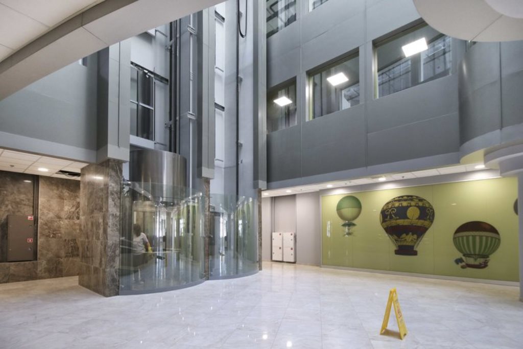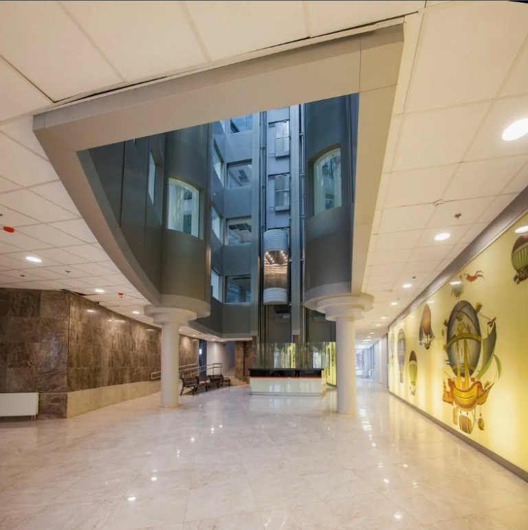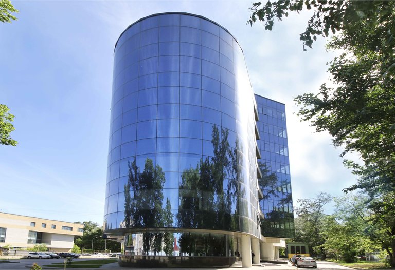 Восьмиэтажное здание общей площадью 12700 кв. м было построено в 2014 году. Яркая архитектурная особенность строения – полукруглые и волнистые стеклянные фасады, будто нарисованные ветром, а также чередование панорамных окон синего оттенка, в которых отражается небо, со светло-серыми облицовочными плитами. Центр здания от первого до последнего этажа занимает открытый многосветный атриум с прозрачной крышей. По периметру атриума расположились офисы.